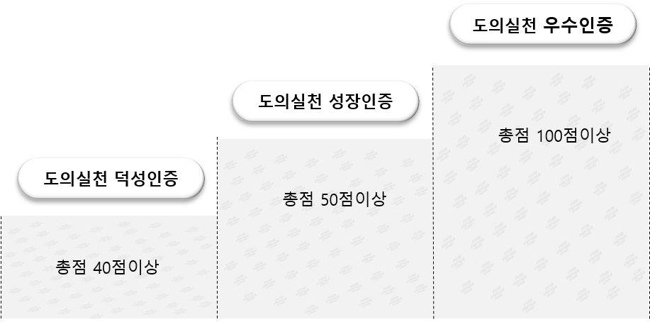 ** 인증 기준 충족 시 해당 인증 부여(자세한 사항은 도덕교육원 문의 또는 ‘웹정보서비스’ -> ‘정보서비스’ -> ‘도의실천인증 관리’에서 확인)
